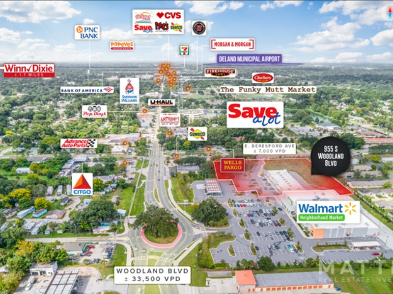 Walmart Shadow Anchored Strip Center955 S Woodland Blvd 14,000 SF100% Leased4-Star Retail BuildingDeland, FL$5,120,000 ($366/SF)6% Cap Rate Retail Space Florida Deland 955 S Woodland Blvd, Deland, FL 32720 ASPECTOS DESTACADOS DE LA INVERSIÓN Strip Center de última generación: construcción en 2018: el comprador comprará un strip center de última generación sin requisitos inmediatos de gastos de capital Excelente ubicación: Deland, FL, está convenientemente ubicado a la salida de la I4, que se conecta directamente con el corazón de Orlando y Daytona Beach, Florida Capacidad para generar ingresos pasivos, reembolso del 100 % de los gastos: un inversionista puede usar una compañía de administración para crear una inversión pasiva y no intervencionista Sombra anclada al minorista más grande del mundo: Shoppes at Deland tiene una ventaja competitiva en el mercado, ya que está anclada a la sombra de Walmart Walmart Neighborhood Market es una tienda de comestibles con grado de inversión y uno de los operadores minoristas más dominantes del mundo Inquilinos orientados a la comodidad: tiendas at Deland es un centro comunitario orientado a la comodidad cuyos inquilinos son los menos afectados por el comercio minorista en línea PROPERTY FACTS Sale Type Investment Property Type Retail Property Subtype Department Store Building Size 14,000 SF Building Class A LoopNet Rating 4 Star Year Built 2018 Price $5,120,000 Price Per SF $366 Cap Rate 6% NOI $306,986 Percent Leased 100% Building Height 1 Story Building FAR 0.03 Land Acres 12.45 AC Opportunity Zone No Zoning Commercial SPACE AVAILABILITY • SPACE • SIZE • SPACE USE • POSITION • AVAILABLE • 7 • 1,400 SF • Retail • - 90 Days Tasación de terrenos $1,530,136 Tasación total $6,608,143 Valoración de mejoras $5,078,007